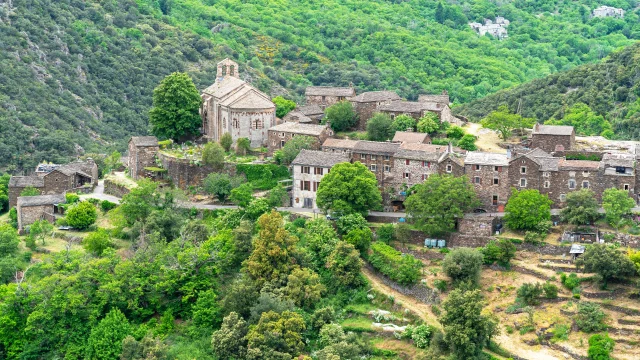 Accroché à flanc de colline, le village de Banne offre un décor de ...
