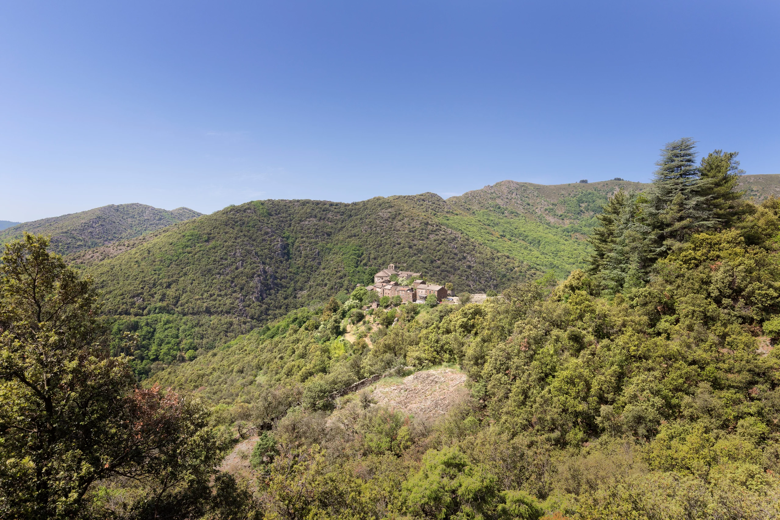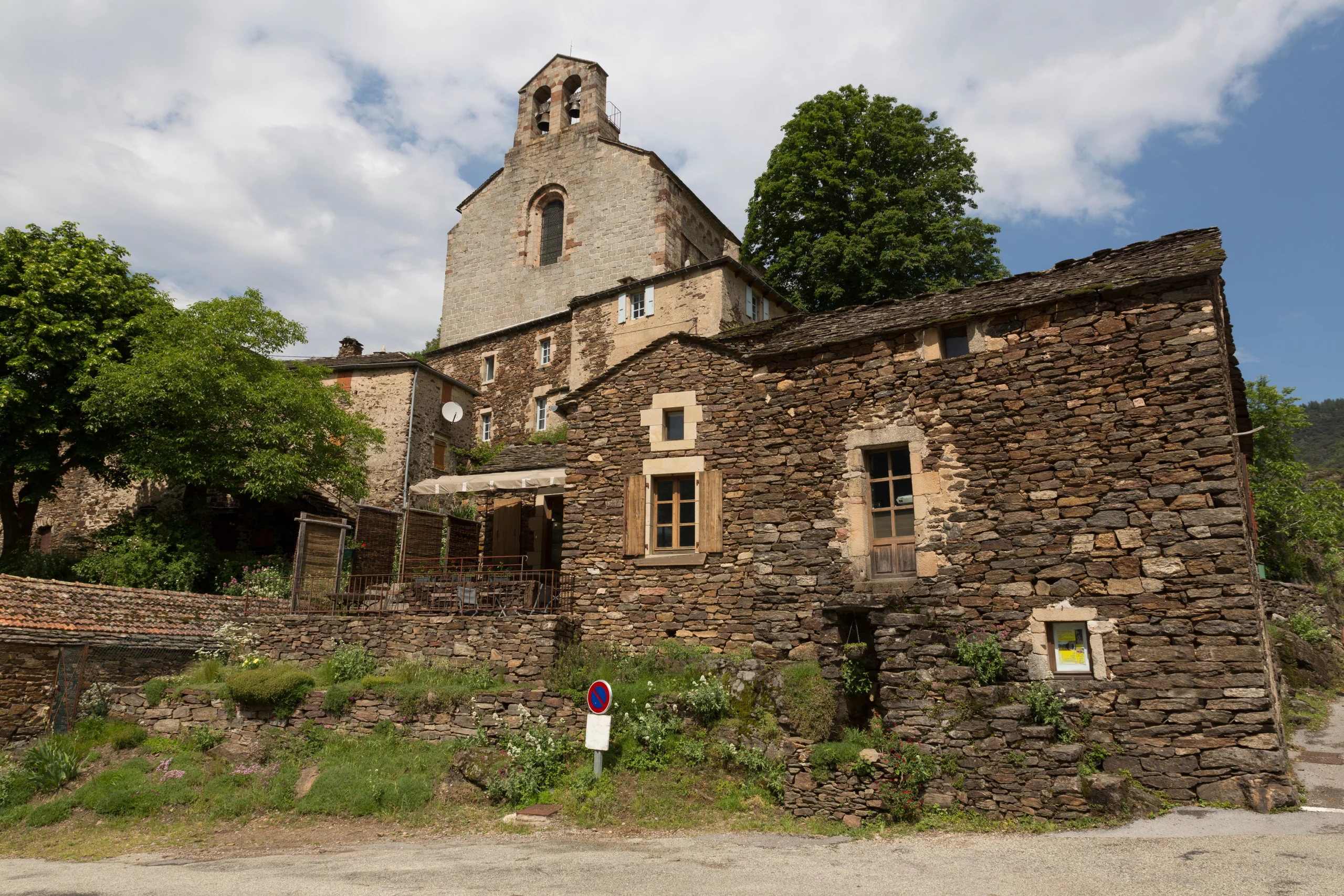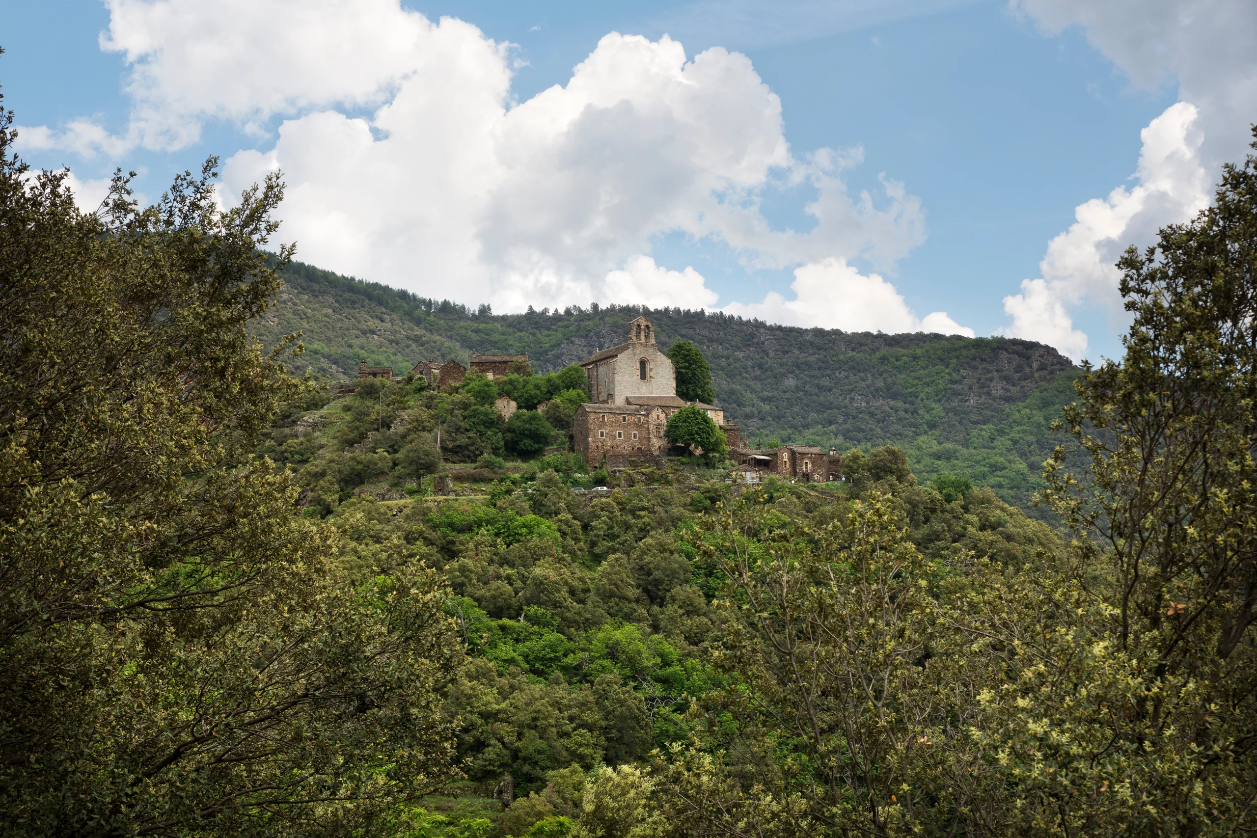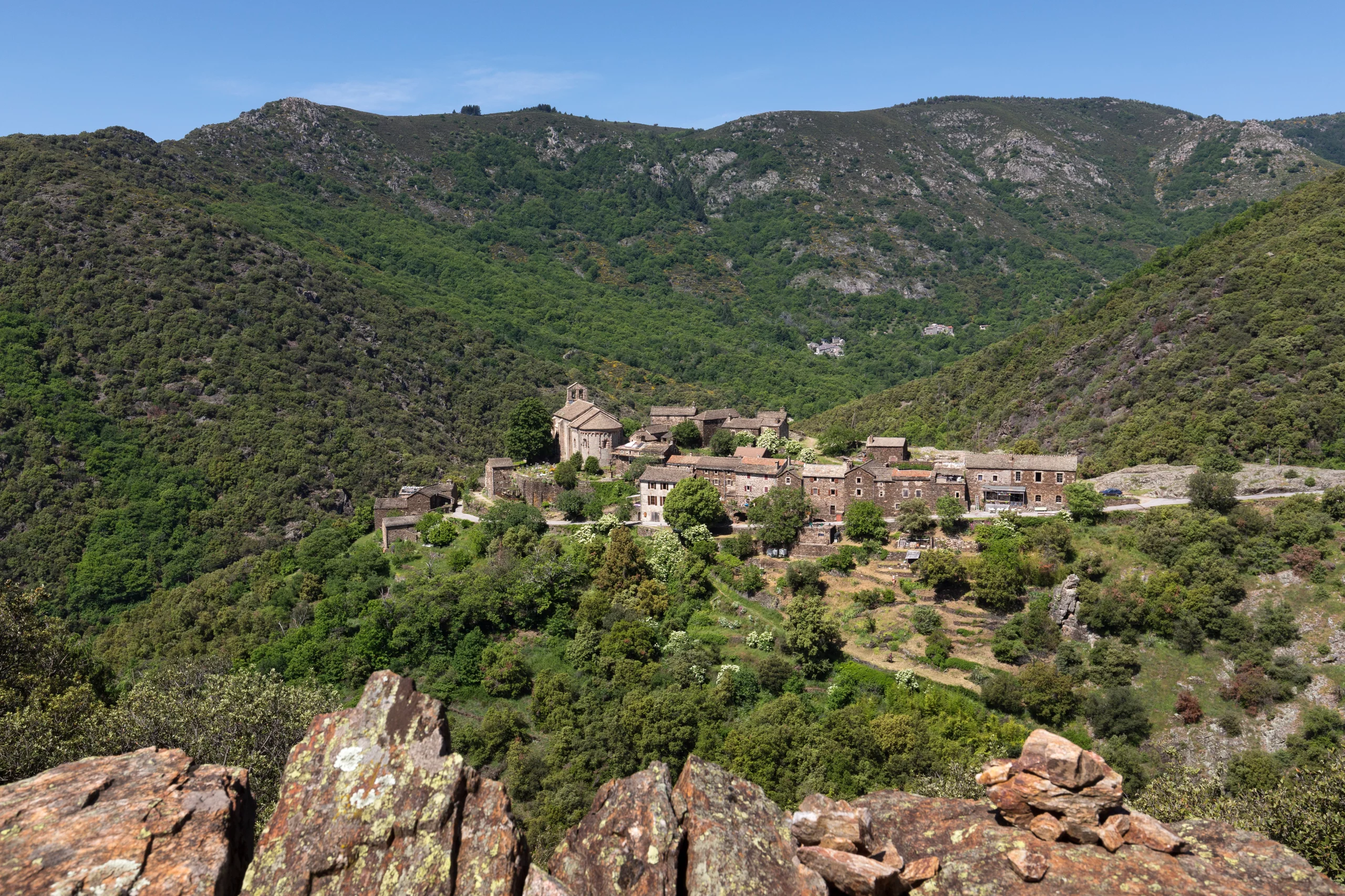 Classée Monument Historique, l’église Notre-Dame de Thines, construite au XIIe siècle, attire les amateurs d’art roman et les passionnés d’histoire. Entièrement en pierres de schiste et marbre local, elle surplombe la vallée dans un calme saisissant. Autour, quelques maisons en pierre et une auberge composent le cœur du village, accessible uniquement à pied depuis le parking en contrebas.