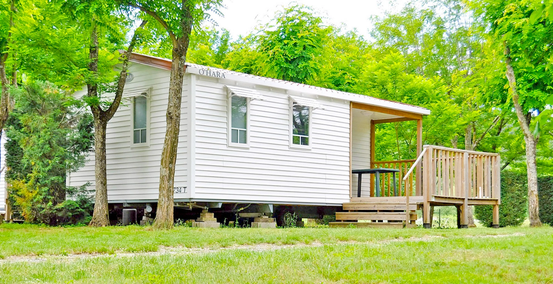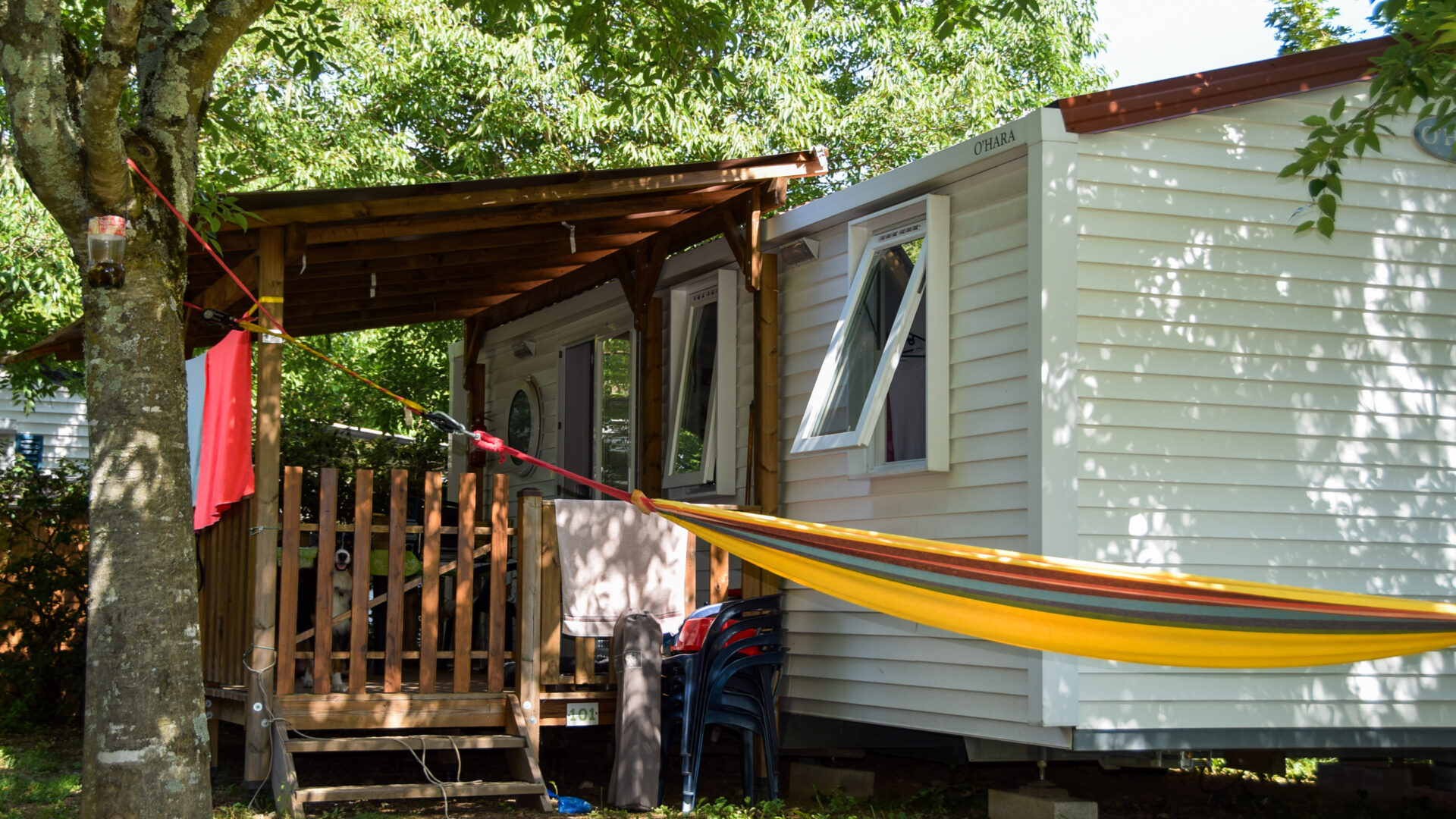 Nos mobil-homes sont tous équipés pour répondre aux besoins du quotidien : cuisine aménagée avec vaisselle, plaques de cuisson, réfrigérateur, micro-ondes ; salle d’eau avec douche ; WC séparés ; et plusieurs chambres avec rangements. La pièce de vie ouvre sur une terrasse extérieure, idéale pour vos repas ou moments de détente à l’ombre des arbres.